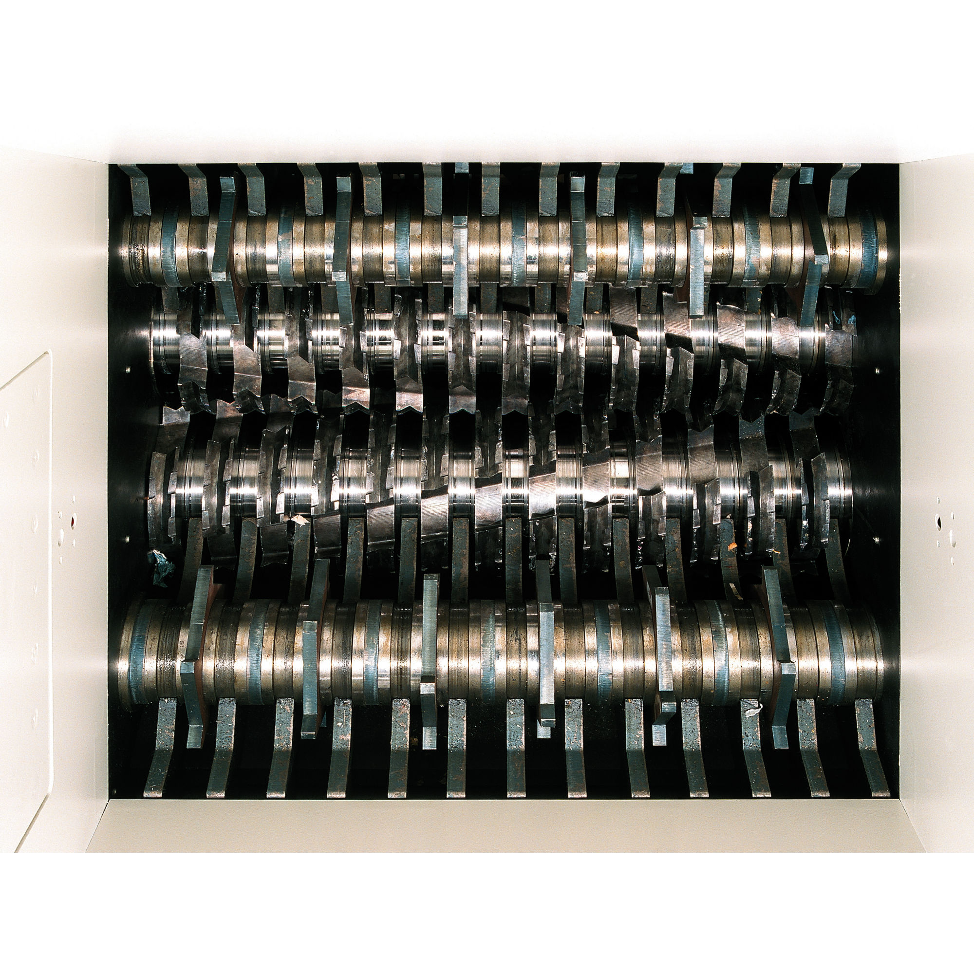 - 1. Aşama: iki alım şaftı ve iki kesim şaftından oluşan dört şaftlı kesim sistemi ile materyal beslemeyi kolaylaştırmak için ön kesim yapılır.