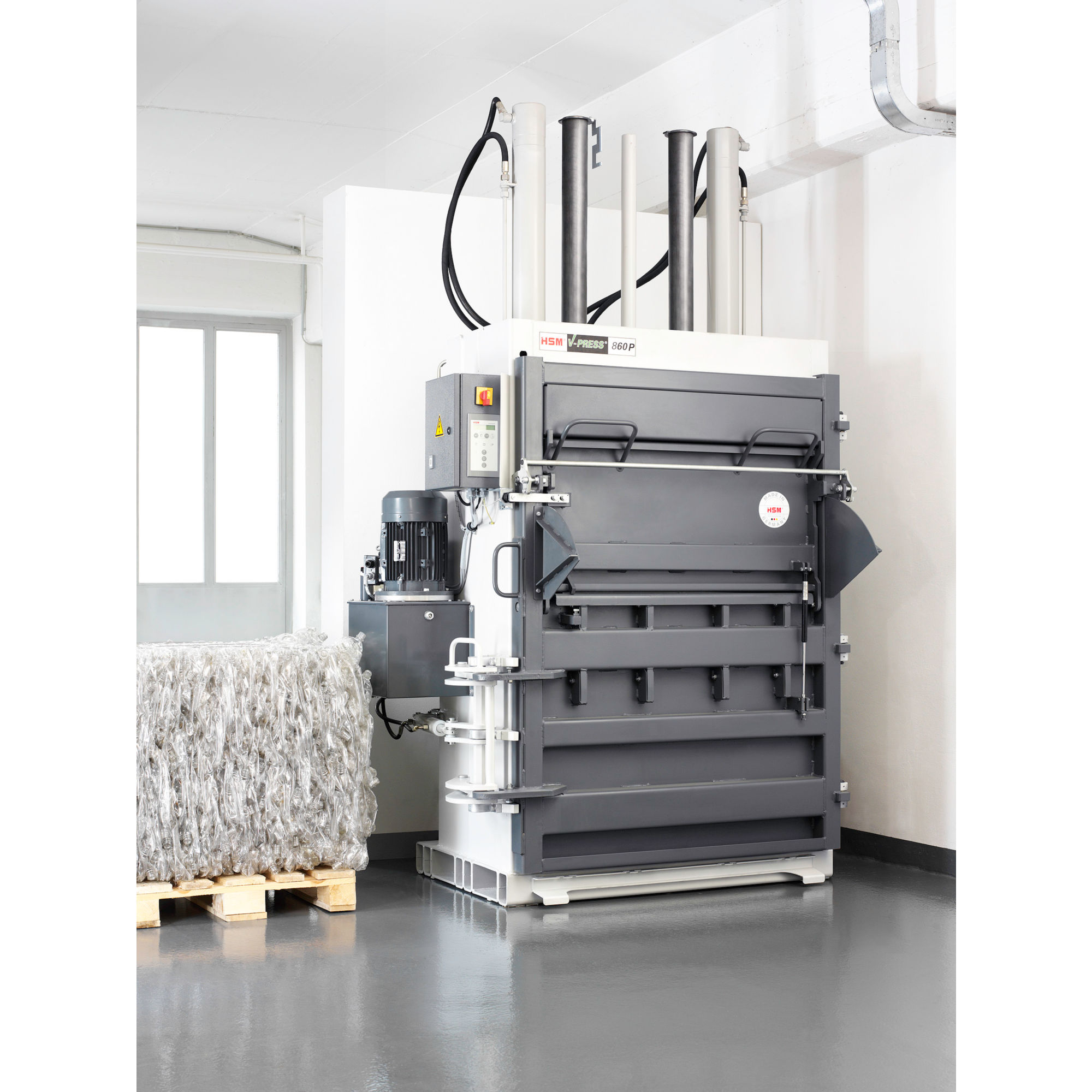 Dikey balyalama presi HSM V-Press 860 P modeli özel olarak açılmış veya delinmiş PET/UBC şişelerin kompresyonu için tasarlanmıştır (diğer materyal talebe isteğe).