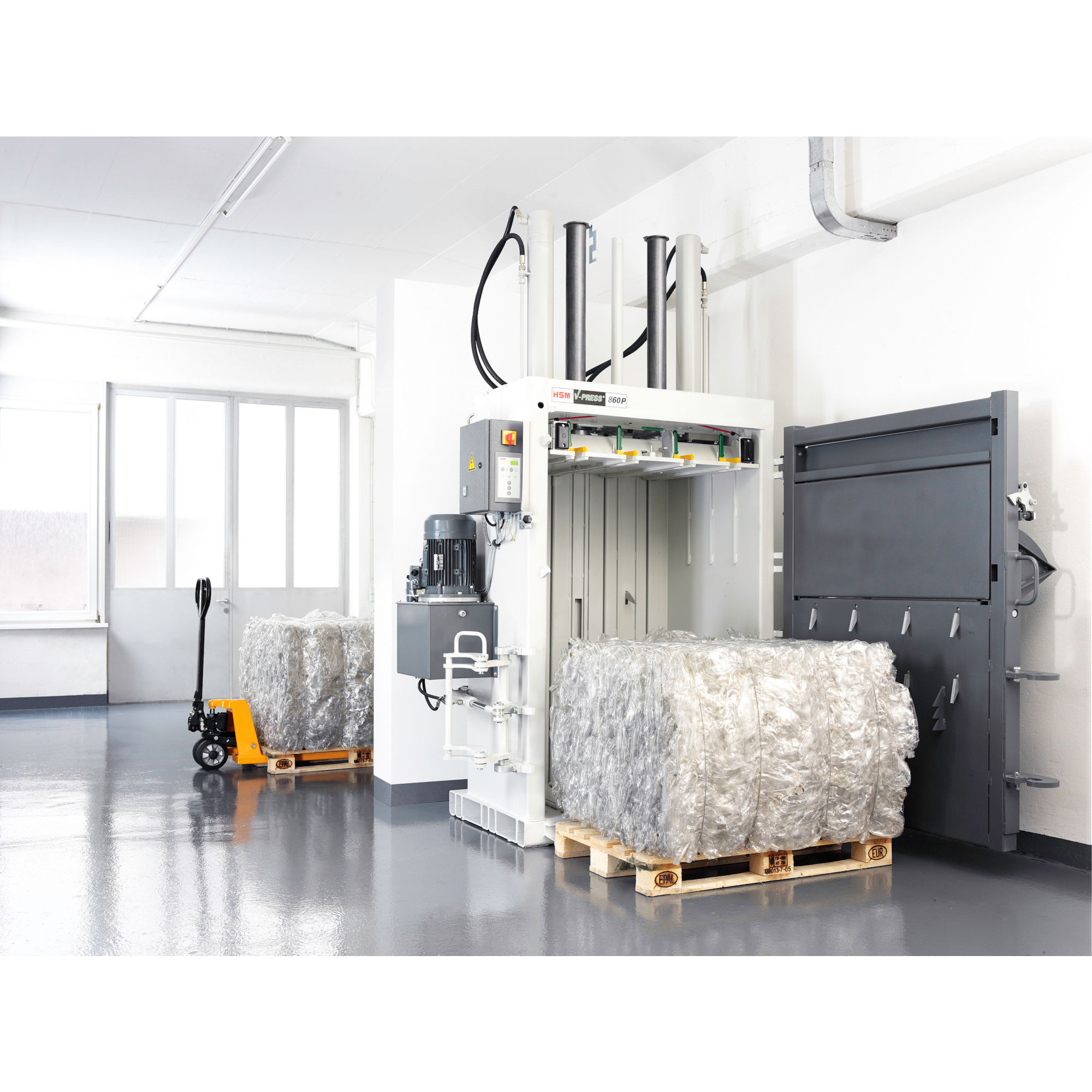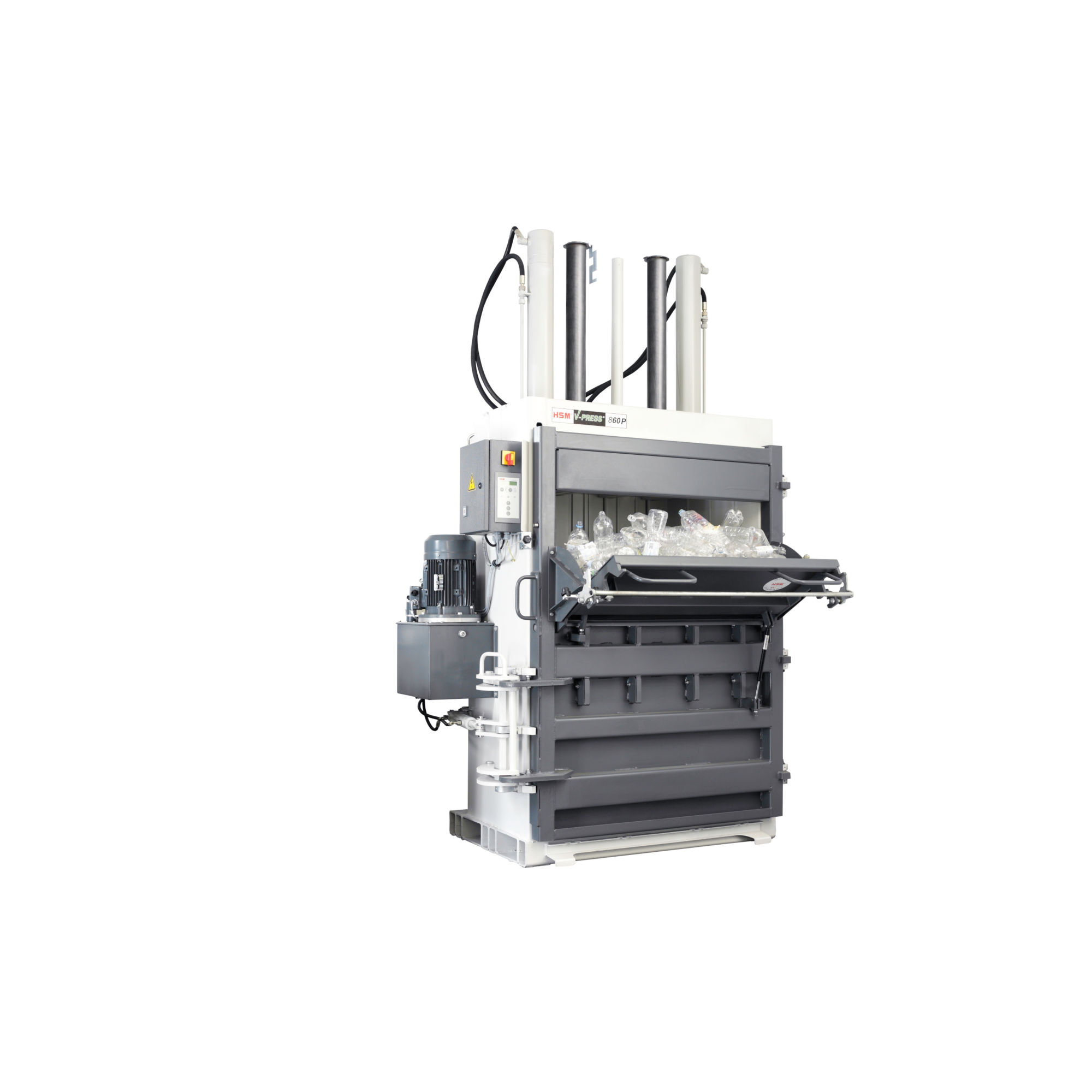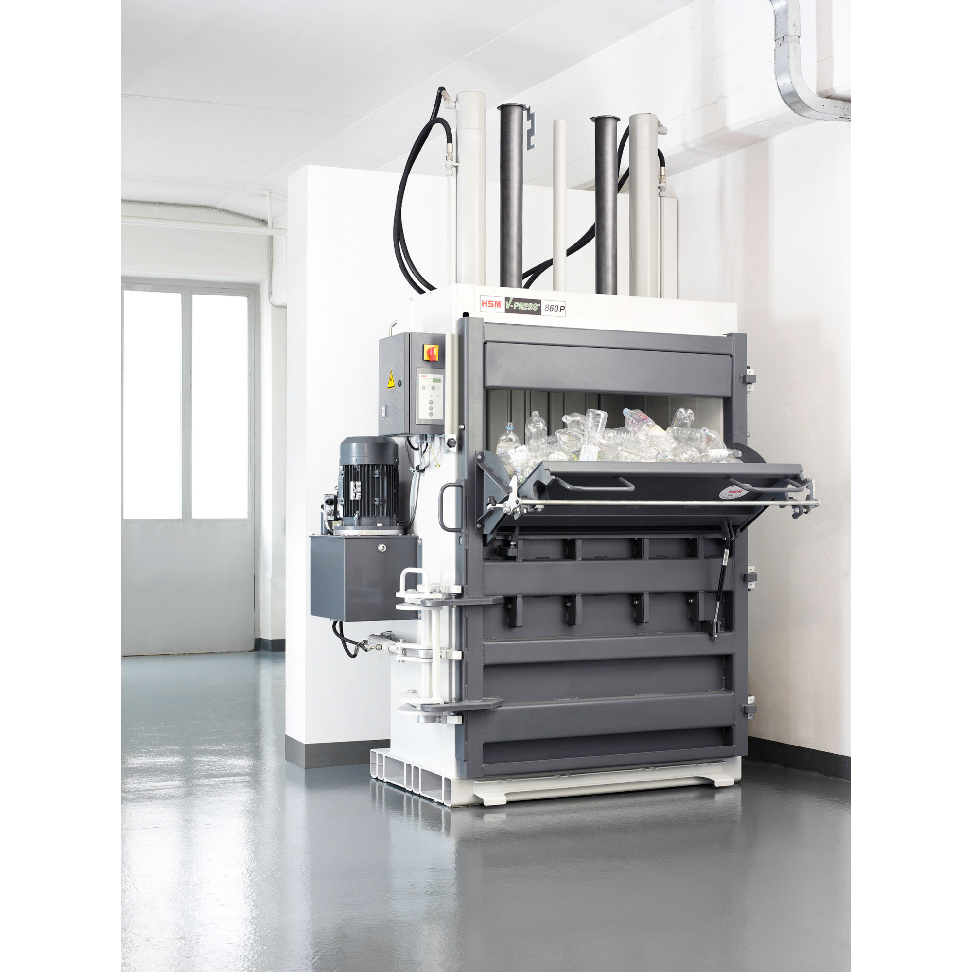 Dikey balyalama presi HSM V-Press 860 P modeli özel olarak açılmış veya delinmiş PET/UBC şişelerin kompresyonu için tasarlanmıştır (diğer materyal talebe isteğe).