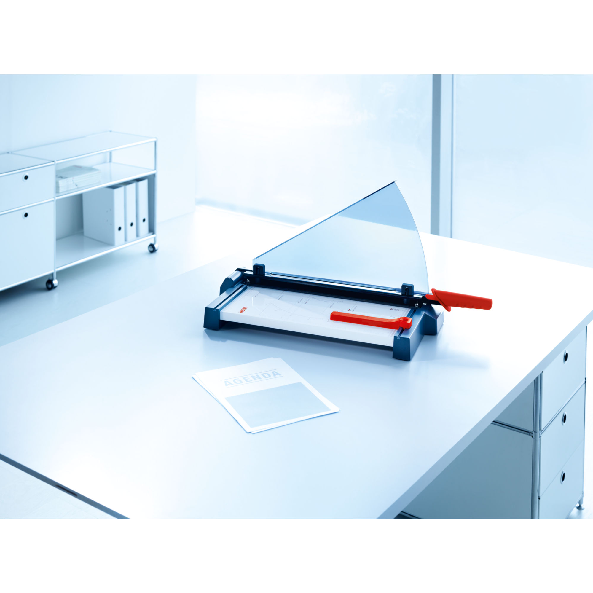 Dayanıklı, çok yönlü ve kolay kullanıma sahip kollu kesme makinesi. DIN A2 landscape formatına kadar kâğıtları ve ince kartonları keser, pratik kullanım sağlar